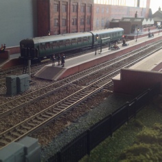 Listen carefully for the platform announcements and look for the photographer and his girlfriend. Note also the work gang removing track in front of the local Model Railway Club carriage opposite platform 1. Perhaps unusually the sector plate fiddle yard is completely visible to the public and attracts a lot of attention.