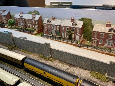 The buildings are pretty well all “Metcalfe”. They are a mixture, the left hand side is an industrial scene including the 3 x power station cooling towers (not to scale but seen from a distance), the front is a row of houses along a road and the right hand end is based on suburban housing, a school, a farm and a canal basin., all intended to provide colour, interest and work for the team. Buildings actually stretch around 3 sides of the layout to add more interest and to provide more space to work on.